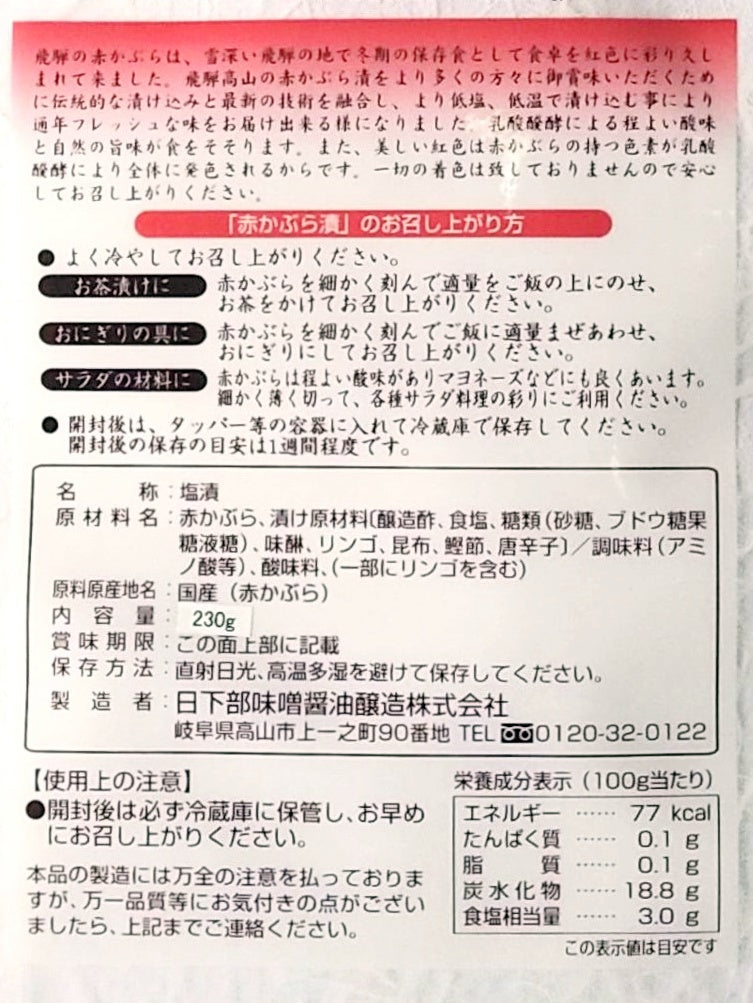 飛騨の赤かぶらは、雪深い飛騨の地で冬期の保存食として親しまれてきました。フレッシュな赤かぶ漬をより多くの方々に御賞味いただくために、伝統的な漬け込みと最新の技術を融合し、低塩・低温で漬け込んでいます。乳酸醗酵による程よい酸味と自然の旨味が、食卓を紅色に彩り食欲をそそります。